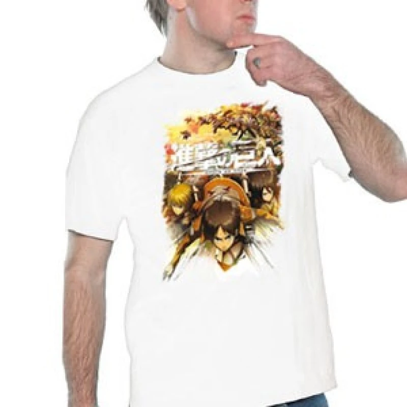 T-Shirt « L’attaque des Titans » blanc à l’effigied es héros du bataillon d’exploration, Mickasa Ackerman, Eren Yaeger et Armin Arlert livrant un assaut fatal à leurs ennemis. Affirmez votre passion pour le manga déjà culte « L’attaque des Titans » en portant vos personnages préférés sur un t-shirt de haute qualité sous licence officielle.